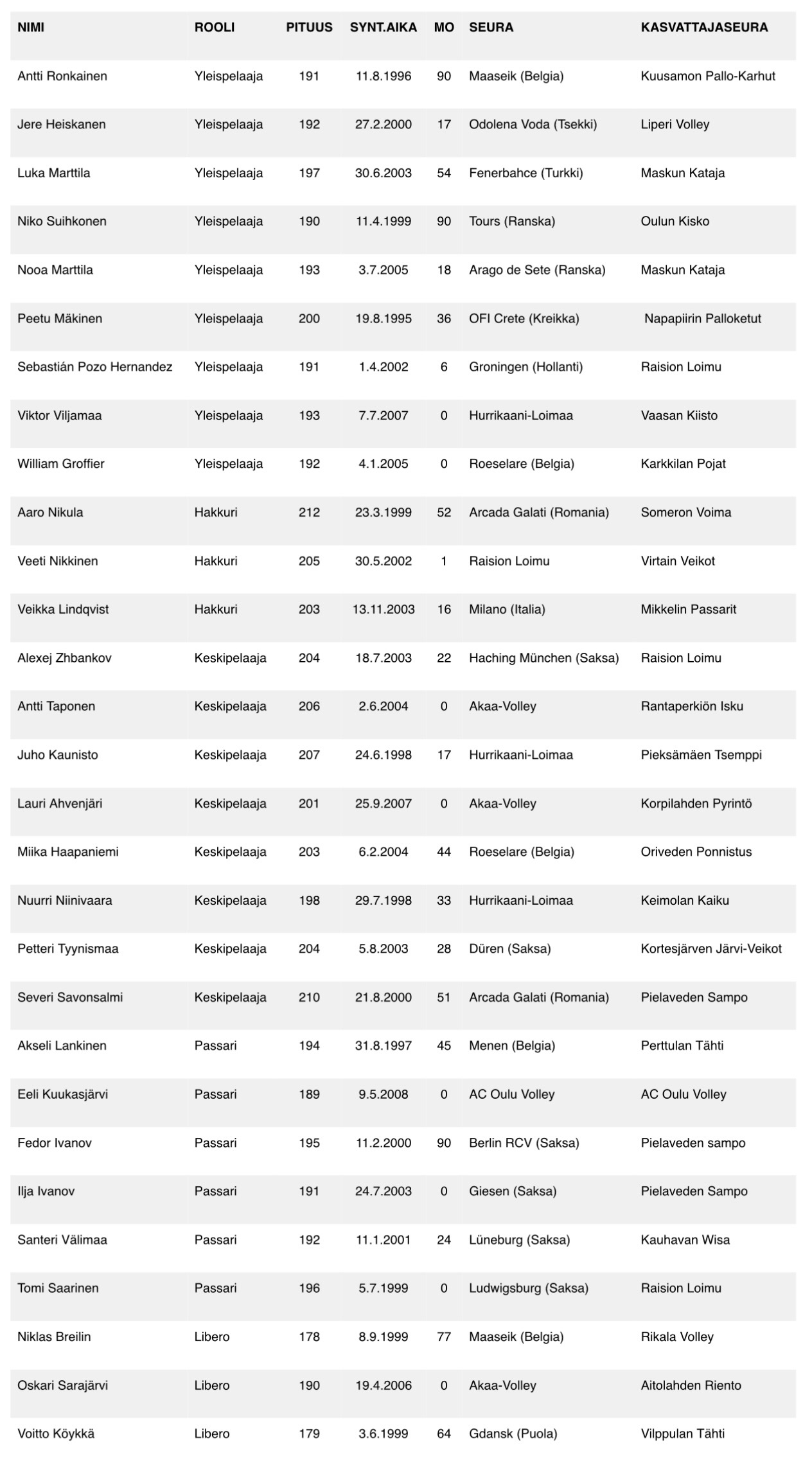 Päävalmentaja Olli Kunnari joukkoineen on valinnut miesten lentopallomaajoukkueen, Veljesten, maajoukkueryhmän kohti kesän Euroopan liigaa. Mukana ns. isolla listalla on 29 pelaajaa ja tältä listalta tulevat pelaajat kolmeen Euroopan liigan turnaukseen sekä mahdollisiin välieriin sekä finaaleihin.